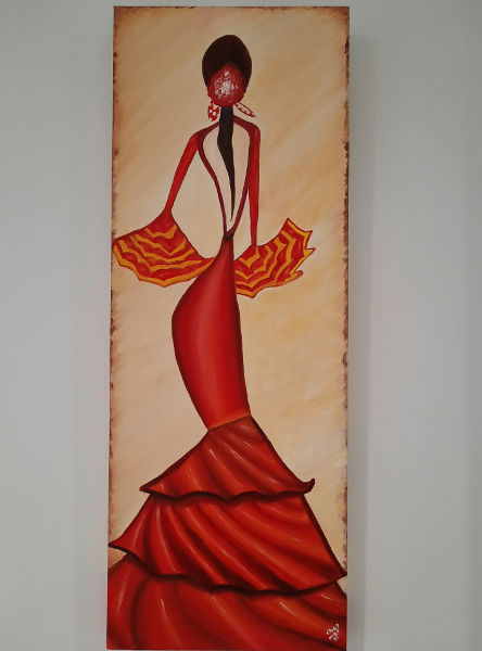 Oleo sobre lienzo. Flamenca en rojo con fondo beige y laterales en marrón.